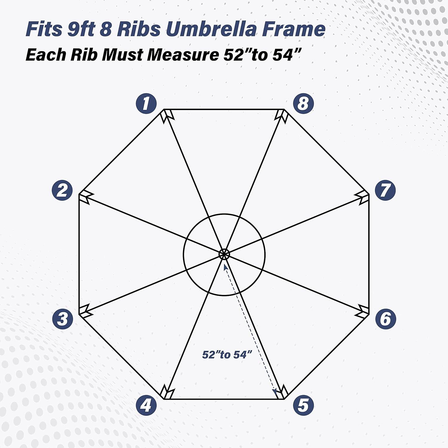 Fits: The patio umbrella replacement canopy fits 9 ft 8 ribs patio umbrellas. Each rib must measure 52″ to 54″, please measure your umbrella rib length before purchase.